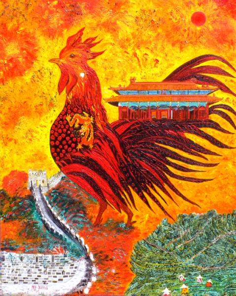 "Voyage du Coq en Chine sous un Feu d'Artifice" (100x81cm.) Huile sur toile, 2015. Oeuvre de la peintre Marie-France Busset