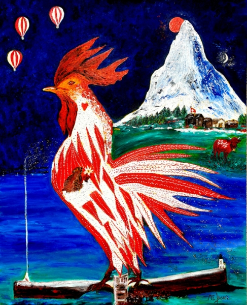 "Le Coq au Cervin s'émerveille en Suisse". (100x81cm.) Huile sur toile, 2019. Oeuvre de la peintre Marie-France Busset
