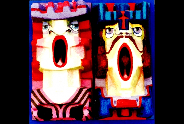 "Cantatori", peinture, techniques mixtes sur carton thermoformé (38x37x10cm) oeuvre en relief 3D. Oeuvre de l'artiste peintre, plasticienne, Arlette DELEVALLÉE.