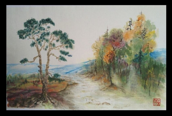 "Paysage" (71 x 52 cm), peinture calligraphique chinoise sur papier de riz marouflé.Oeuvre de Sylviane Leblond, Artiste peintre, Grand Trophée du Style, Lauréate du Palmarès 2023.