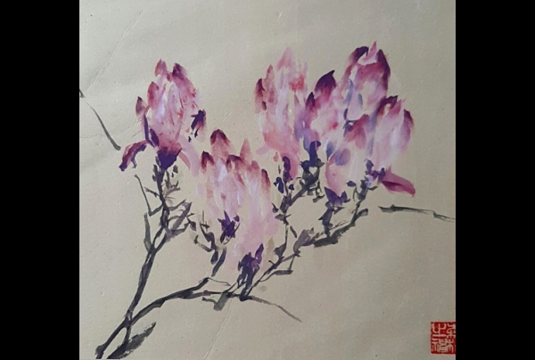 "Magnolia" (40x40cm), peinture calligraphique chinoise sur papier de riz marouflé.Oeuvre de Sylviane Leblond, Artiste peintre, Grand Trophée du Style, Lauréate du Palmarès 2023.