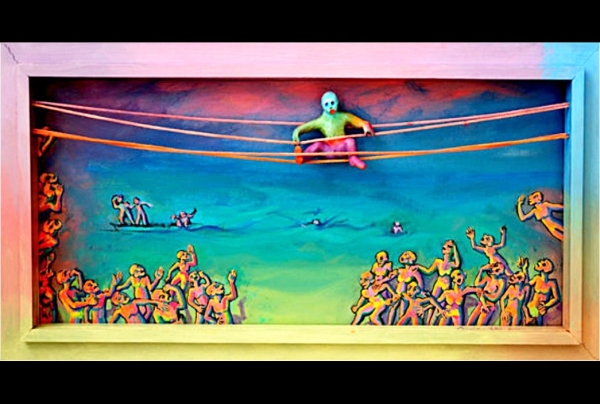 "Sur la Corde raide". "Série "De Fil et de Corde". (Dimensions 60x30x05cm.) Modelages terre cuite polychrome sur carton apprêté. Cadre-châssis, peinture à l'huile, ficelle.Oeuvre d'Arlette Delevallée