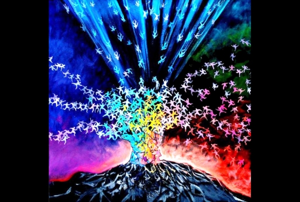 "On Vient tous d'un Ailleurs". Tech mixtes sur toile, dim. 100x100cm. Oeuvre d'Arlette Delevallée. Artiste peintre, plasticienne