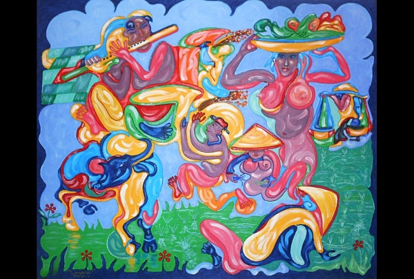 "Vie Campagnarde” huile et acrylique (techn. mixtes) sur toile (65x54cm). Oeuvre tactile en cloisonné d'Emile Van Long, artiste peintre