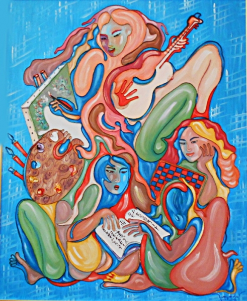 "Les Arts" techn.mixte (92x73cm) Oeuvre tactile en cloisonné du peintre Emile Van Long