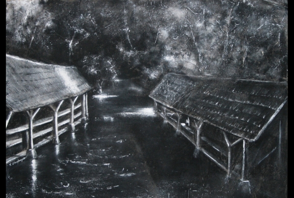 "Les Lavoirs", Fusains et pastels sur papier marouflé, dimensions 65x50 cm, oeuvre de Frédéric Steinlaender
