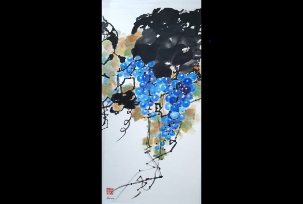 "Blue Grapes" (80x40 cm). Papier de riz. Peinture calligraphique chinoise, oeuvre de l'artiste Sylviane LEBLOND peintre