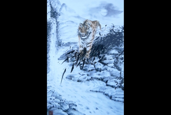 "Tigre au Crépuscule" (80x60cm). Papier de riz. Peinture calligraphique chinoise, oeuvre de l'artiste Sylviane LEBLOND peintre
