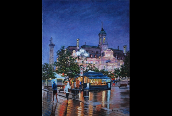 "Place Jacques-Cartier sous la pluie " Huile sur toile (dim. 40,64x30,48cm), oeuvre de l'artiste-peintre ANTO, Antonine RODIER, Lauréate du Palmarès 2024.