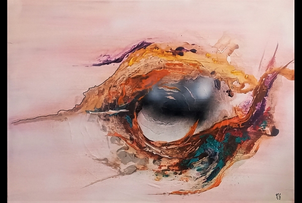 "Chimère", peinture 2024 (dim.70H x 50L cm, épaisseur 2cm). Acrylique et technique mixte sur toile tendue sur châssis bois, avec entretoise. Tableau de Michèle GUILLOT, artiste contemporaine abstraite. Lauréate du Palmarès.