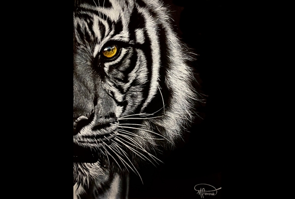 "L'Oeil du Tigre", peinture. Huile sur toile Format 40 x 30 pouces. Portrait animalier. Peinture animalière. Œuvre de Nancy LAVOIE, artiste-peintre, Lauréate du Palmarès. Trophée Européen des Arts et Styles 2024.