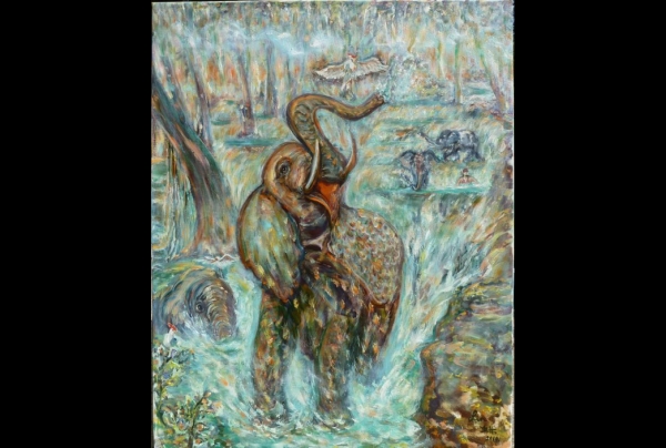 "Au pays des Mille Éléphants" Huile sur toile (92 x 73 cm) 2010 Œuvre de l'artiste peintre Lin QIU BERTALAN, lauréate du concours, Ici, l'imaginaire de l'artiste, empli de poésie et d'exprimé narratif a séduit le Comité du Jury,