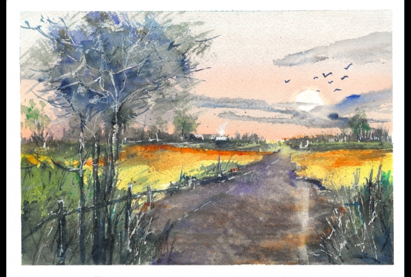 "Route de Campagne", Aquarelle, (25x18cm), œuvre de Frédéric STEINLAENDER. Une sensibilité qui s'exprime dans toute sa vérité. L'intériorité de l'artiste rencontre le spectateur en sublime osmose. Beauté du paysage,mélancolie transparaissent