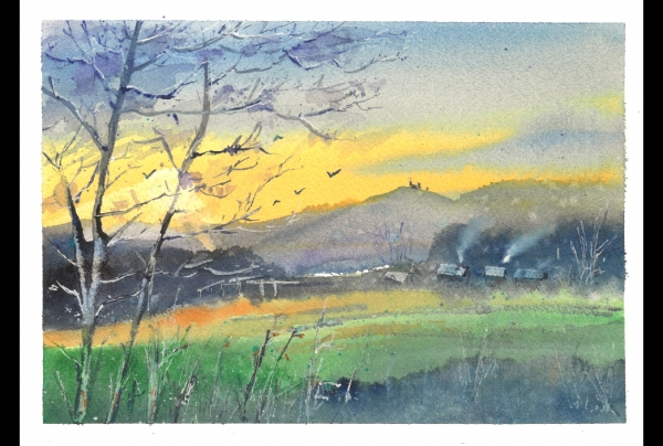 "Au loin le Haut Koenigsbourg" (25x18cm) Aquarelle. Œuvre de Frédéric STEINLAENDER. Paysage en plan éloigné, dans le lointain le Château, monument du Patrimoine Alsacien. Un sens abouti de la représentation des distances