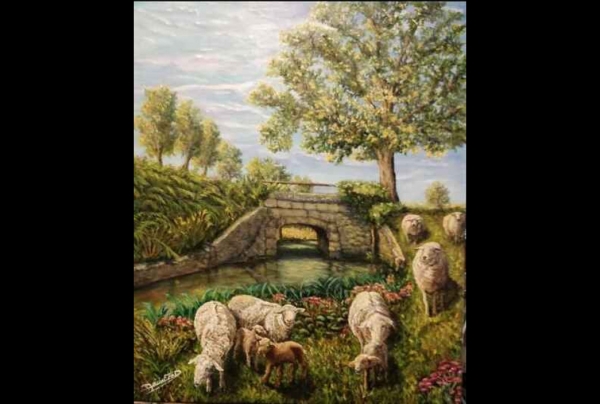 "Les Moutons d'Alloue " (Charente 16) (dim 65x54cm) Acrylique sur toile de lin du peintre Frédéric BOIRIE (Fred BOIRIE) Trophée International de la Création dans les Beaux-Arts. Son tableau respire la paix, la spiritualité, l'intemporel
