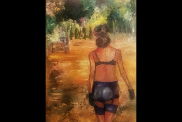 "Lola" , (80x60 cm) , peinture, huile sur toile. Œuvre de Jeanne SIMON. Artiste peintre. Elle confirme ici son concept qui exprime l'avenir, le lendemain tournant le dos au présent. Le spectateur est invité à rejoindre Lola et aller vers le lointain.
