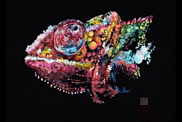 " Caméléon ", 24x32 cm, aquarelle métallisée japonaise sur papier coton noir. Œuvre de CLAIRE.J.CHARTIER, artiste peintre, Lauréate du Palmarès au concours de la IIIe Journée Mondiale des Styles Artistiques 2024.