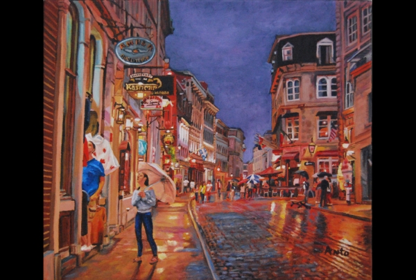 "Gouttelettes de Pluie", (30,48x35,56 cm), peinture, huile sur toile.Pluie, reflets, lumières, ambiance. Tableau de l'artiste ANTO Rodier, peintre majeure aujourd'hui. Lauréate du Palmarès, Trophée de la IIIe Journée Mondiale des Styles Artistiques.