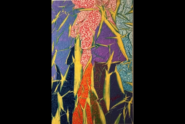 "Énergie cosmique", (180x80cm) acrylique sur double support, papier froissé sur toile. Le peintre contemporain Alain DELIC, a créé et présenté un style qui innove sur l'international une nouvelle esthétique de "pointillisme abstrait".