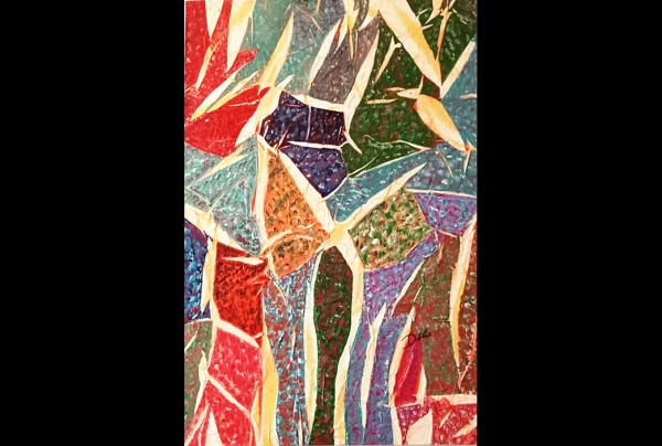 "Intensité Multichromique", (130x89cm) acrylique sur double support, papier froissé sur toile. Formes et couleurs redéfinies dans leur éclat par le pointillisme abstrait du peintre Alain DELIC, son style porte une non-figuration intégrale.