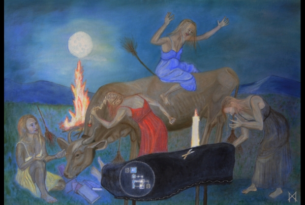 "The Sorcerer's Apprendice (with Goethe)",(70x100cm), peinture, huile sur toile, 2024. œuvre de Margaretha GUBERNALE. Une poétique étonnante. L'au-delà, le merveilleux et l'IA se sont donné rendez-vous au bout de son pinceau.