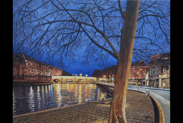 "Pont Marie, Paris" huile sur toile, 61x76,2cm d'ANTO Rodier, Artiste-Peintre. Une œuvre poétique et romantique. L'atmosphère de nuit ajoute un charme inédit à ce paysage parisien. L'artiste maîtrise clarté, lueurs, reflets avec un talent expérimenté.