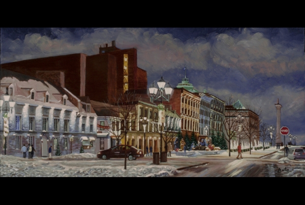 "Nuit de Noël, Place Jacques-Cartier", huile sur toile, 38,1x76,2cm. Œuvre d'ANTO Rodier. L' Artiste fait partie des rares peintre qui savent traiter si subtilement l'atmosphère de la nuit dans la ville. ANTO a conquis les premiers rangs dans ce domaine