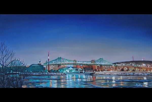 "Pont Jacques-Cartier et la Ronde " huile sur toile, 30,5x61cm toile d'ANTO, L'Artiste-Peintre exprime l'univers de la ville la nuit. Entre magie de l'art et rêve émerveillé elle dénoue sous nos yeux les secrets d'une nouvelle ambiance esthétique