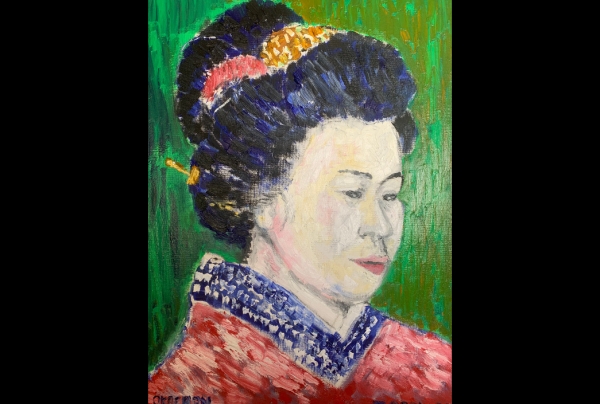 "Okachan" ("Maman"), huile sur toile, 40x50cm de Toshio ASAKI, Artiste-Peintre. Son style simple, fort, va à l'essentiel, il nous offre une esthétique du portrait créé avec harmonie. Un visage qui nous emplit de respect et relie le peintre à ses racines