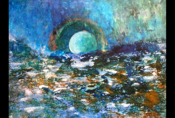 "Fragilité" encres de couleurs (70x50cm). Cette œuvre de CORIANDRE, exprime la profondeur de son ressenti, la beauté de la Planète lointaine, presque inaccessible à atteindre. Rêve en allégorie du réel, mirage ou intuition dans la nuit des temps