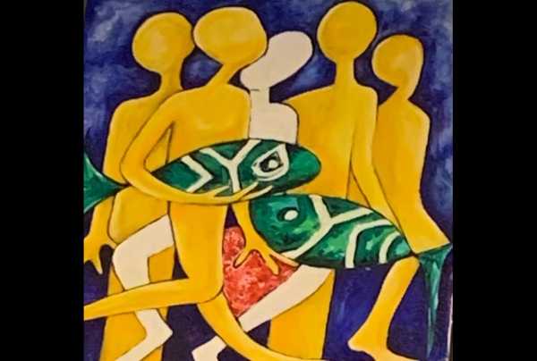 "Fantôme aux Poissons", 2013, acrylique sur médium (45x50cm) Le style d'Angeline CATHELAIN témoigne surréalisme et symboles sont inhérents au rêve, à l'inconscient. L'artiste crée avec talent des scénographies surréalistes contemporaines.