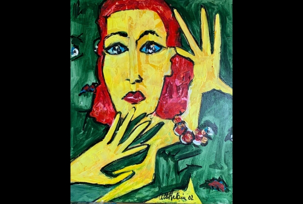"La Peur", 2002, acrylique sur carton, (50x50cm) Avec cette œuvre Angeline CATHELAIN, traite l'angoisse humaine, la sensation incontrôlée, le cauchemar, le rêve peut faire ressurgir phobies, fantasmagories ou craintes immémoriales.