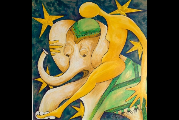 "Elle et Lui", 2014, acrylique sur toile, (50x50cm). Le lyrisme et la poésie d'Angeline CATHELAIN, s'inscrivent avec harmonies et équilibres de formes et couleurs dans ses compositions. Son imaginaire vit dans une esthétique picturale libérée.