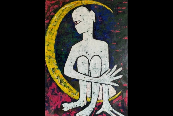 "L'Homme de Lune", 2005, acrylique sur papier marouflé,(60x80cm) L'œuvre d'Angeline CATHELIN nous renouvelle une poétique du rêve. Elle innove avec talent une peinture archétype. C'est un nouveau Pierrot icône qu'elle apporte dans l'art contemporain