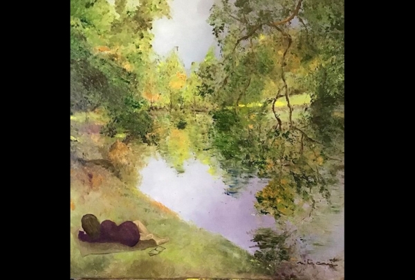 "Rêverie au Bord de l'eau", huile sur toile, 60x60cm, 2021. Rita CAU représente ici le lien intense entre l'être et la Nature, elle saisit ce temps solitaire et poétique de rêverie entre le ciel et l'eau qui permet la fusion des ressentis avec le paysage