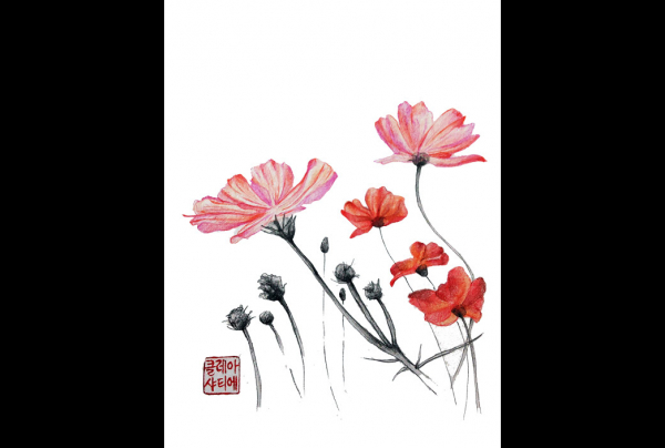 "Cosmos",14,8x21cm dessin floral crayons couleurs crayons graphite 2025. CLAIRE.J.CHARTIER, par sa technique élaborée, montre ici sa recherche sur la légèrté ultime de ces fleurs. Elle l'exprime par son talent et ses choix de médiums.