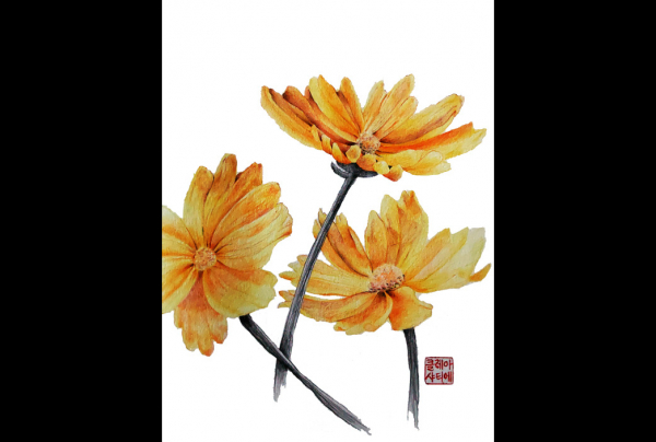"Marguerite",14,8x21cm, crayons de couleurs, crayons graphite. Pour CLAIRE.J.CHARTIER, le style, comme l'expression de formes végétaliennes dans le dessin floral doivent posséder équilibre et tout autant répartition harmonieuse des lignes et volumes.