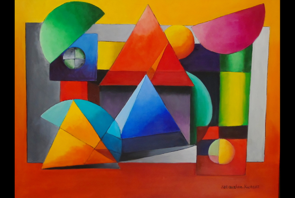''Construction''. 2015 (81x60 cm) Huile sur toile. La position des volumes, des couleurs, créent une animation étonnante d'harmonie, l'imaginaire aboutit à une vérité picturale. Jacqueline HUBERT fait apparaître en Art une autre esthétique du Beau.