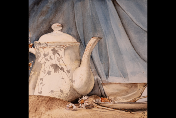 ''L'Instant Thé'' 39 x 29 cm, aquarelle. Isabelle HELLY DORDET à l'art de voir au-delà d'une vision première, l'histoire ou la poésie que peut comporter l'objet, elle peint avec de l'idée, donnant une forte originalité, un souffle de vie à ses aquarelles.