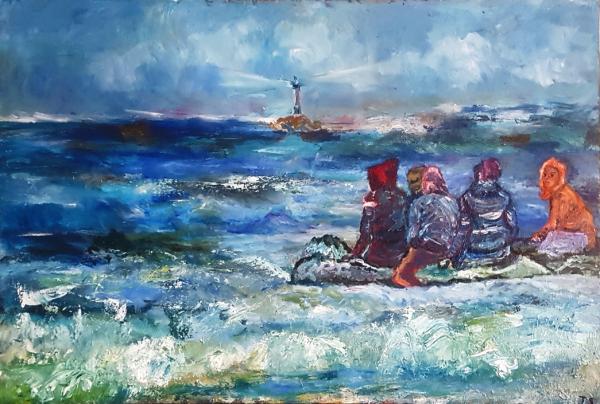 "La Traversée", 90x60cm , huile sur toile, un exemple dans l'Oeuvre de Jeanne SIMON, quand elle délivre un message reliant l'art à la vie sociale. Elle exprime le monde hors de son atelier, assumant le rôle et le devoir du peintre témoin de son temps.