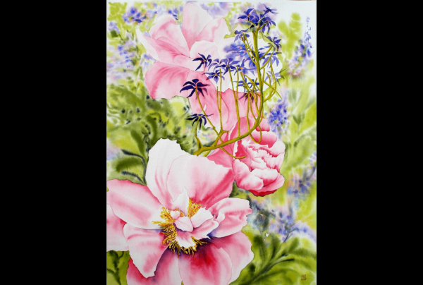 "Éclosion". Aquarelle 57x40cm. Le style d'Annie d'HERPIN est unique et bien reconnaissable. C'est le plus souvent une immersion dans le monde floral, dont elle extrait les impressions picturales de beauté naturelle, de formes et couleurs en liberté.