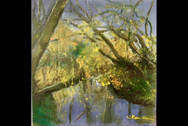 "La Petite mare du Parc Rimbaud", huile sur toile 30x30cm Par ce paysage emblématique de l'eau à l'intérieur des terres, un thème favori de l'impressionnisme, Rita CAU, réussit une alchimie de paix et beauté rend ce tableau intemporel.