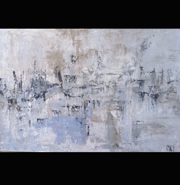 "Impression" 50x100 cm. Les marines en abstraction de Christiane BROUSSARD interprètent le paysage portuaire avec un style innovant.