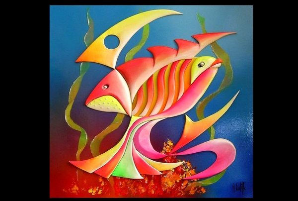 "Poissons Exotiques", oeuvre de Georges CASTILLE - Tableau Bois sculpté 3D (60x60cm)