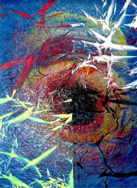 "Trou Noir" ou "Divine Infinity" peinture Alain DELIC (130x89cm, huile laqué papier de soie plissé sculpté Double support sur toile)