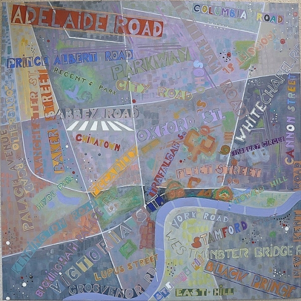 "LONDRES" Huile sur toile 100x100cm. Série "Capitales" de Gérard SUISSIA (gros-plan sur l'oeuvre)
