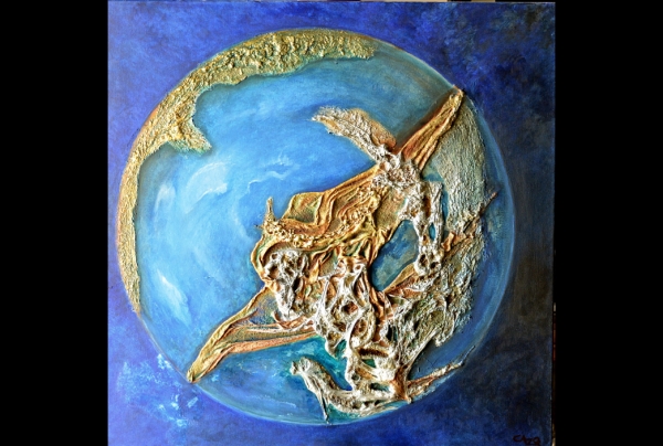 "PLANETA CAERULEAM" du peintre Cazorla-Cazo. Huile et matières sur chassis entoilé Dim.80x80cm épaisseur 3 à 4 cm (2018)