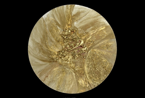 "SOL AUREUS" du peintre contemporain Cazorla-Cazo. Huile et matières sur chassis entoilé Diamètre 60cm épaisseur 3 à 4 cm (2018)