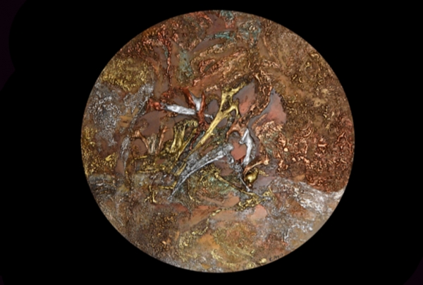 "RADICES TERRAE" peinture de Cazorla-Cazo. (Huile et matières sur chassis entoilé Diamètre 90cm épaisseur 3 à 4 cm)