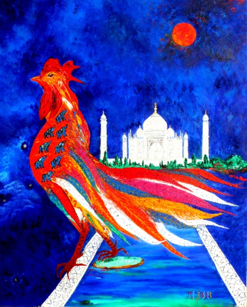 "Le Coq Rêve du Taj Mahal". Huile sur toile 100x81cm. Oeuvre de Marie-France BUSSET, peintre.